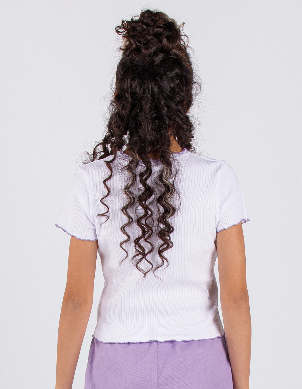 Укороченная футболка сшита из трикотажа "лапша" с нежным цветочным принтом. Края футболки обработаны оверлоком.