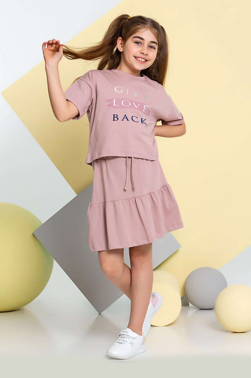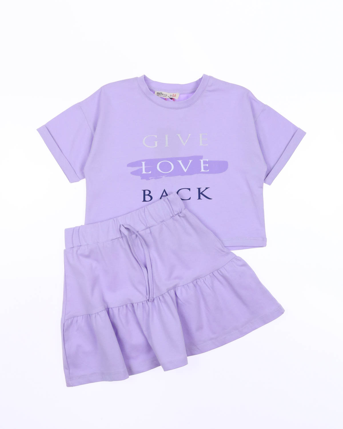 Летний костюм для девочки Smile оптом. Костюм для девочек из  хлопка с добавлением эластана. В наборе юбка свободного летящего кроя и футболка с короткими рукавами. Футболка укороченная, прямого кроя, на груди надпись. Хлопковый костюм идеален в летнюю жару. Натуральная ткань позволяет дышать нежной детской коже. Костюмчик на каждый день.