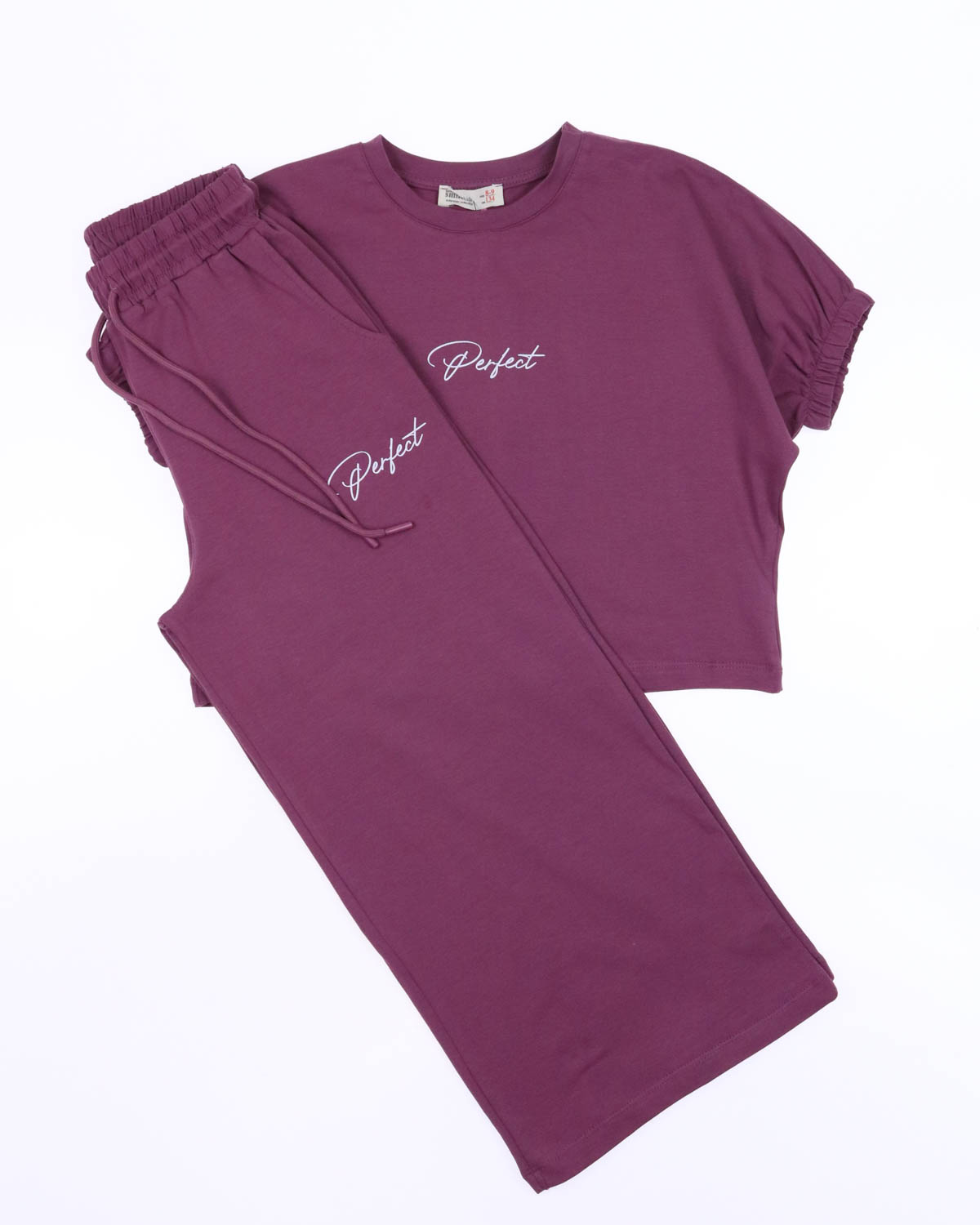 Комплект Smile оптом состоит из свободных брюк на широкой резинке и укороченной футболки. Рукава присборенны эластичной резинкой.