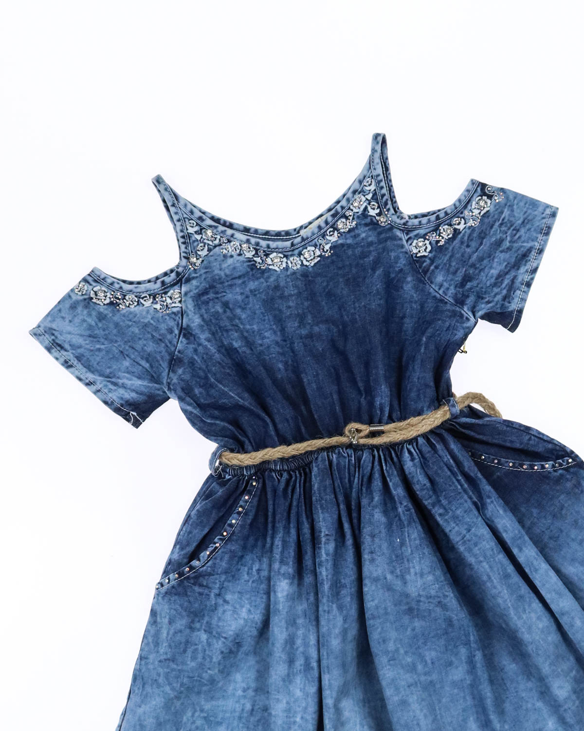 Нарядное платье из тонкой джинсы  понравится каждой девочке и станет ее любимым выбором на теплый летний день.  Горловина и плечи декорированы цветочной вышивкой и стразами. Талия подчеркнута эластичной резинкой. Пышная юбка с боковыми карманами.