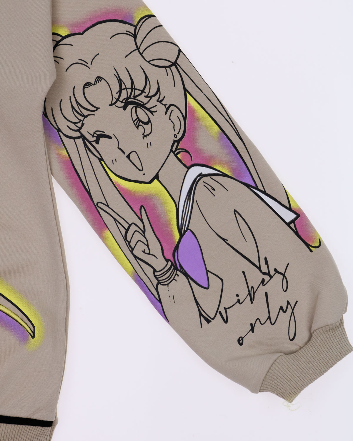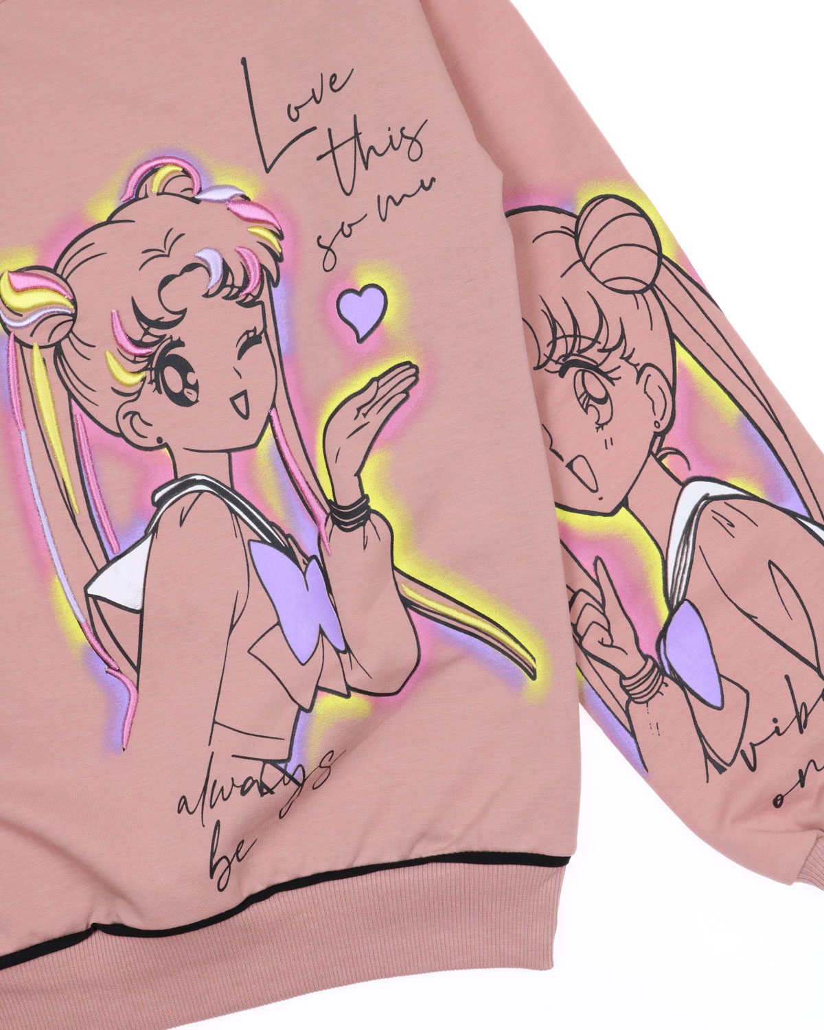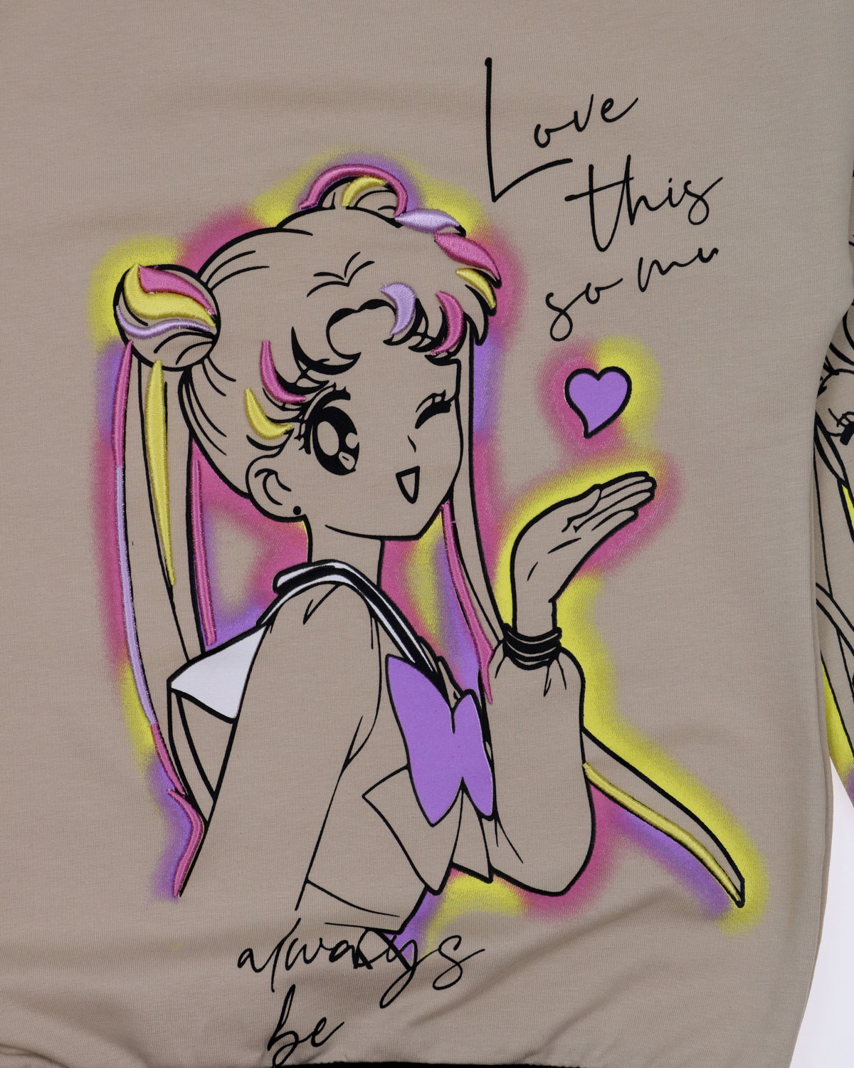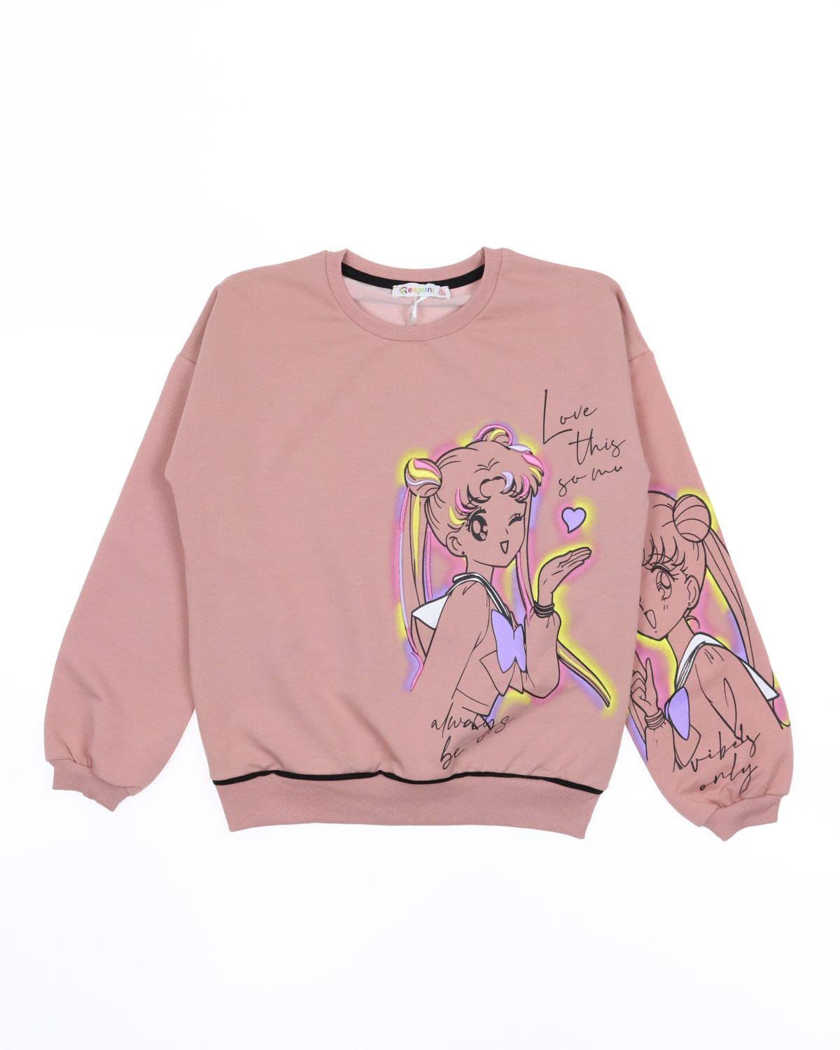 Свитшот BERMINI для девочки умеренного объема оптом,  выполнен из трикотажа футер 2х нитка (петля). Линия плеча спущенная, принт дополнен вышивкой.
