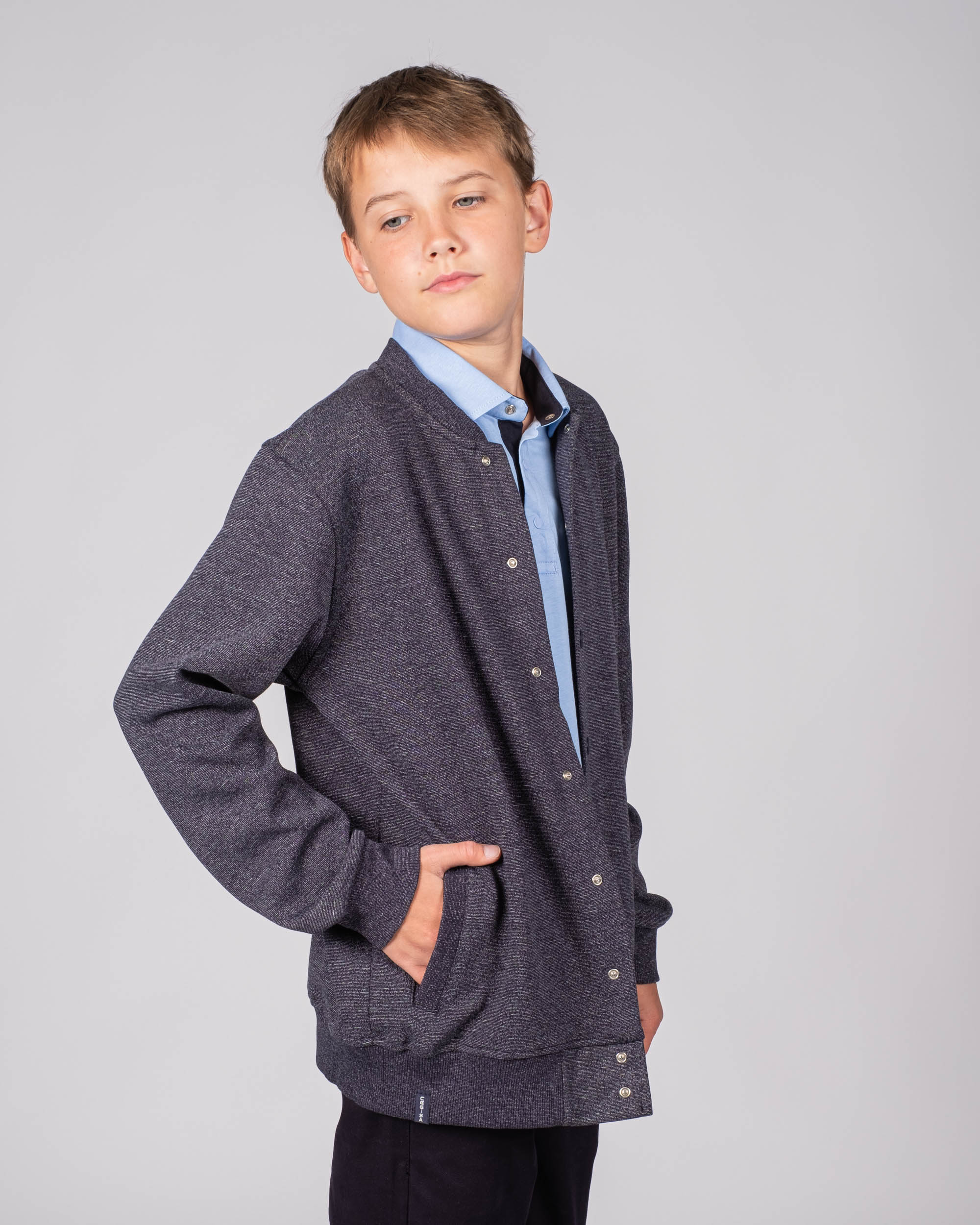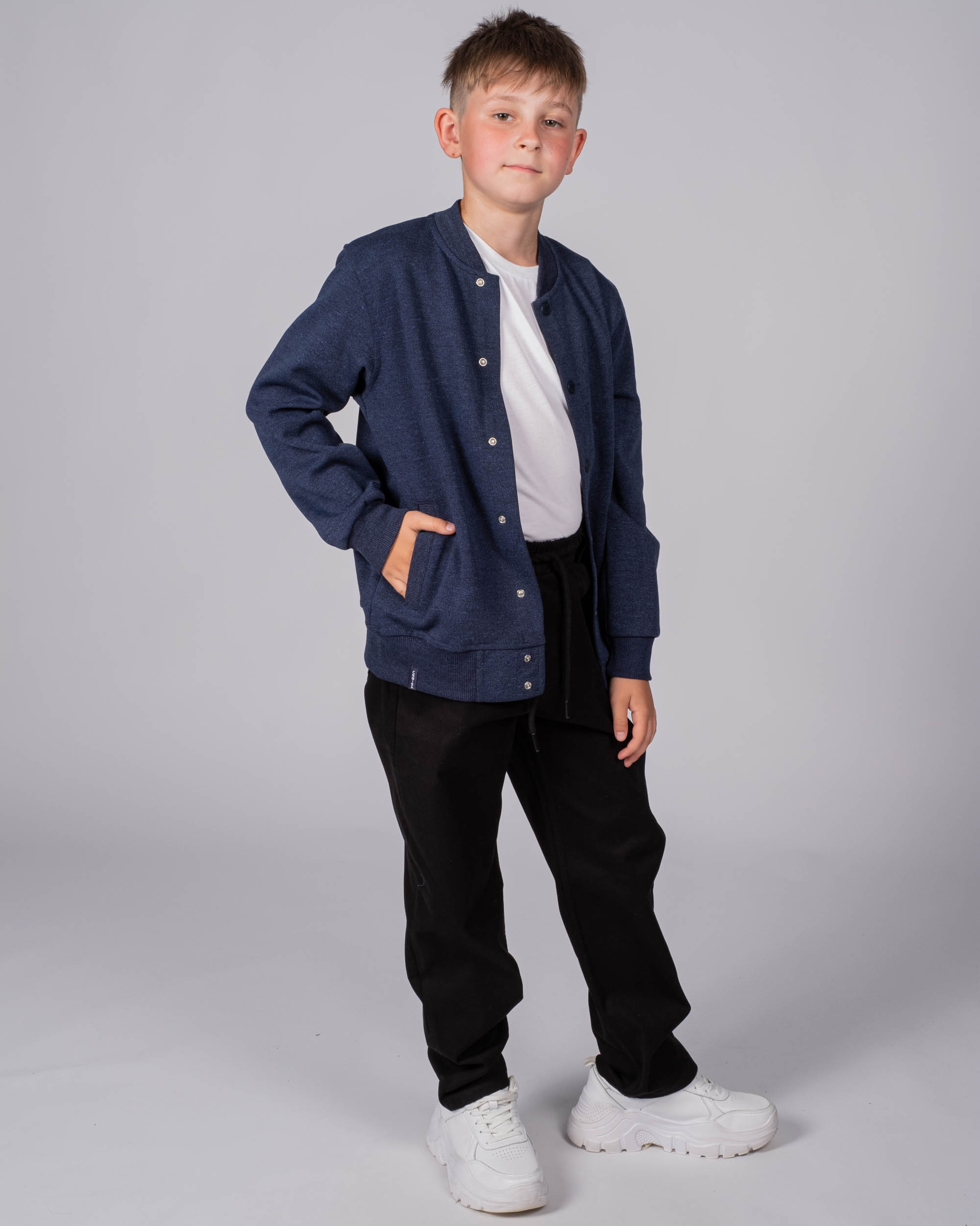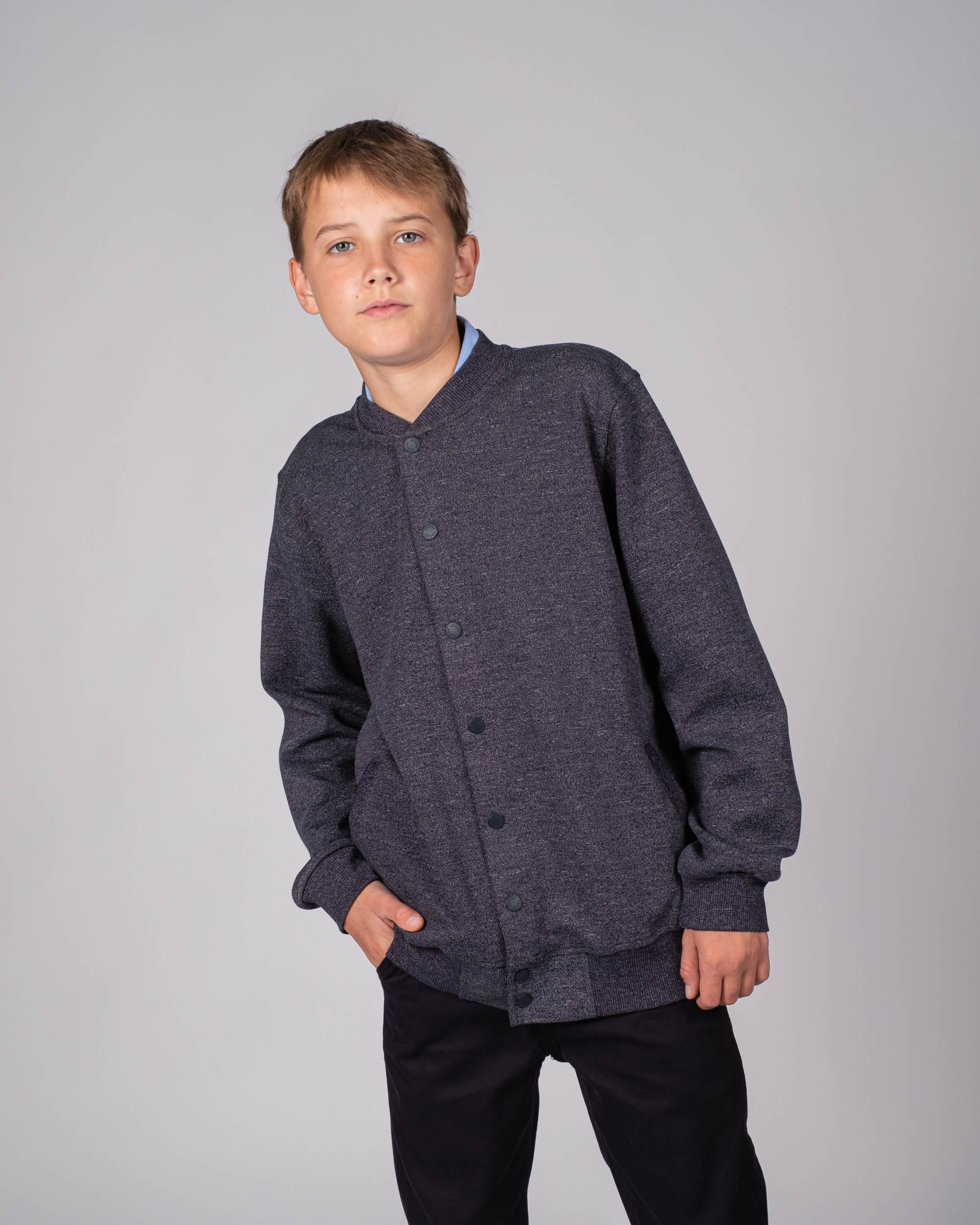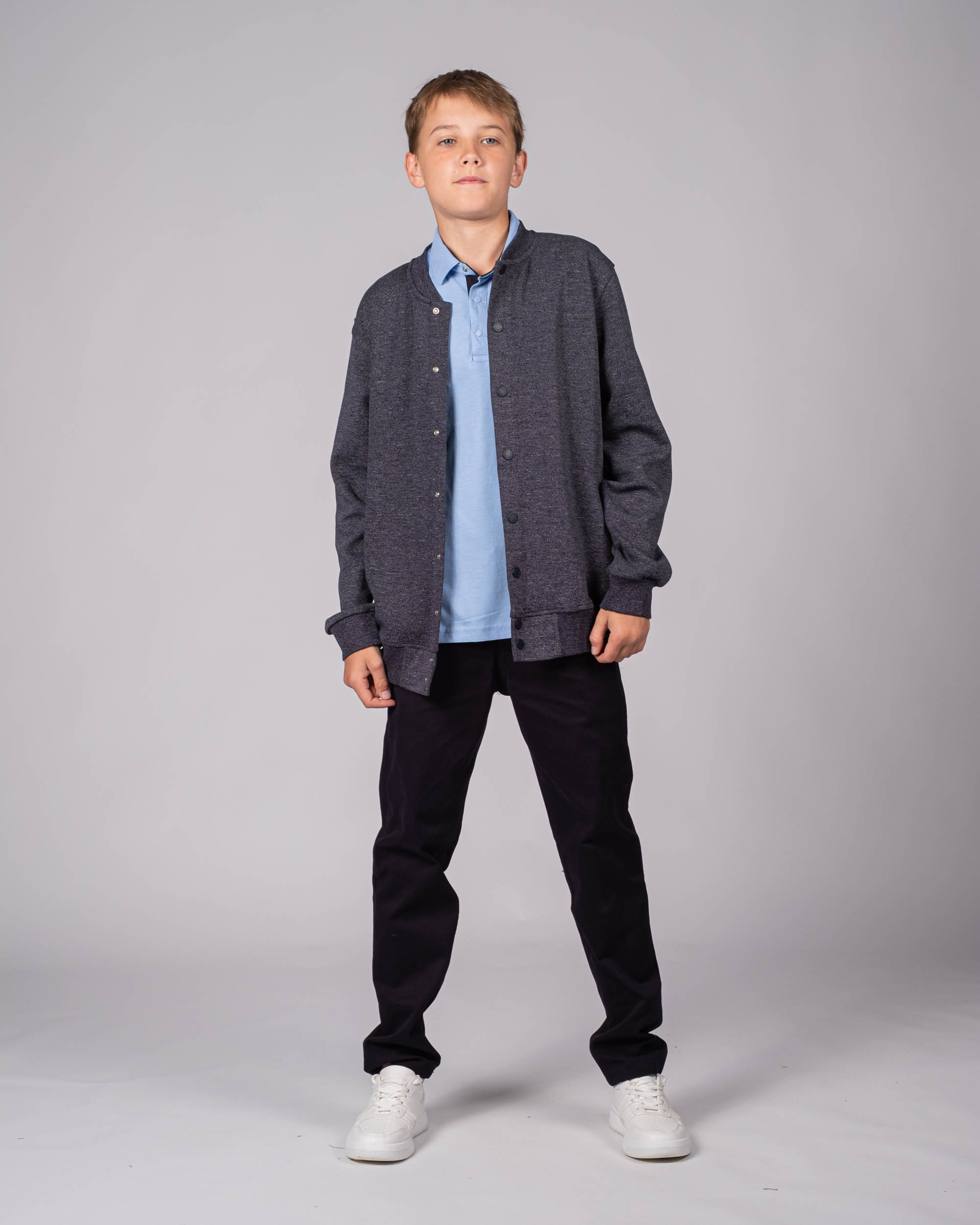 Трикотажный бомбер Cegisa для мальчика оптом. Выполнен из смесовой ткани, в составе которой натуральный хлопок с  добавлением полиэстера. Воротник стойка. Низ изделия и рукава на трикотажном манжете. Вместительные карманы и разъемная застежка - кнопки. Хорошо сохраняет цвет и форму при длительной носке и после многократных стирок. Прекрасно будет смотреться как школьная форма.
