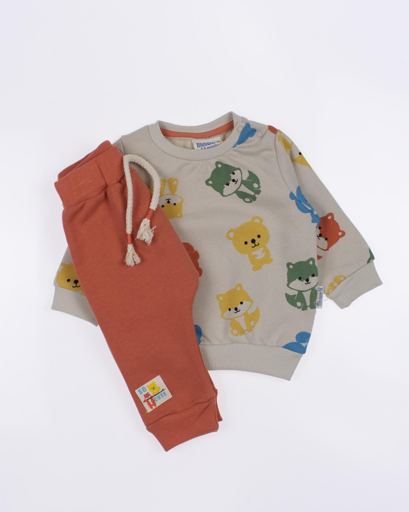 Мы предлагаем оптовые продажи детской одежды производства Турция. Хлопковый костюм  MINIWORLD выполнен из футер (петля), что гарантирует комфорт и безопасность для самых маленьких детей. Свитшот имеет удобную застежку-кнопки на плече, что облегчит процесс надевания и снятия одежды. Штанишки с мягкими манжетами на эластичном поясе идеально подходят для ношения с подгузником, обеспечивая свободу движений и комфорт. Детский милый принт на костюме поможет развить фантазию и воображение ребенка, делая его образ ярким и запоминающимся. Костюм MINIWORLD - отличный выбор для маленьких модников и их заботливых родителей. Не упустите возможность приобрести этот уникальный товар оптом по выгодной цене!