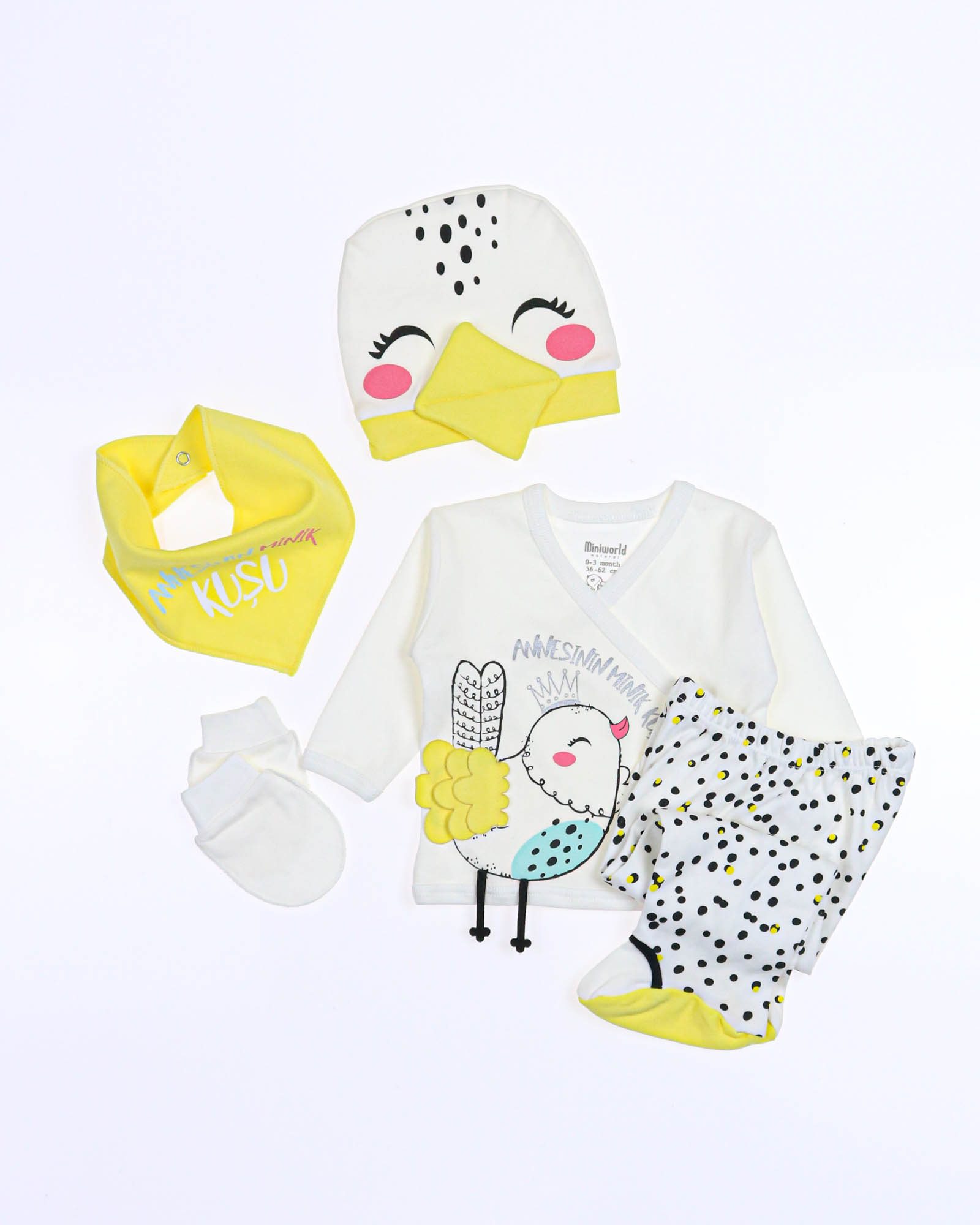 Детский комплект для новорожденного ребенка из 5 предметов, упакован в красивую подарочную коробку с прозрачным окошком. В комплект входит : распашонка, рукавички-царапки, слюнявчик, ползунки и шапочка. Комплект  отлично подходит  для первого подарка.